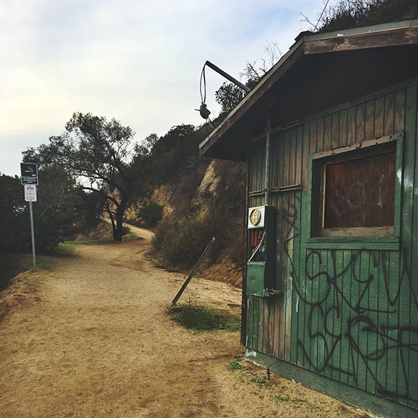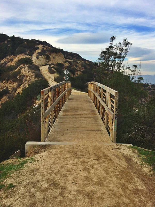 As you make your way up the fire road your views of the Griffith Park Observatory will begin to open up and soon you will find yourself upon a small wooden footbridge to your left and a little blue sign (that has unfortunately been graffitied) to your right.